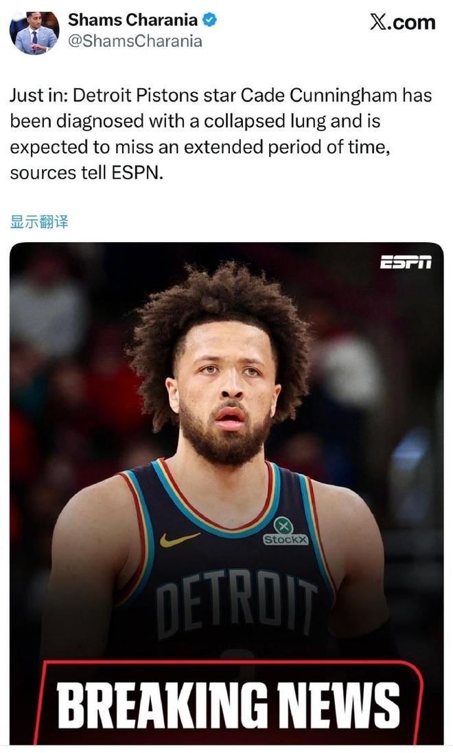 活塞遭重创:坎宁安被诊断出气胸预计缺席很长时间 或失评奖资格