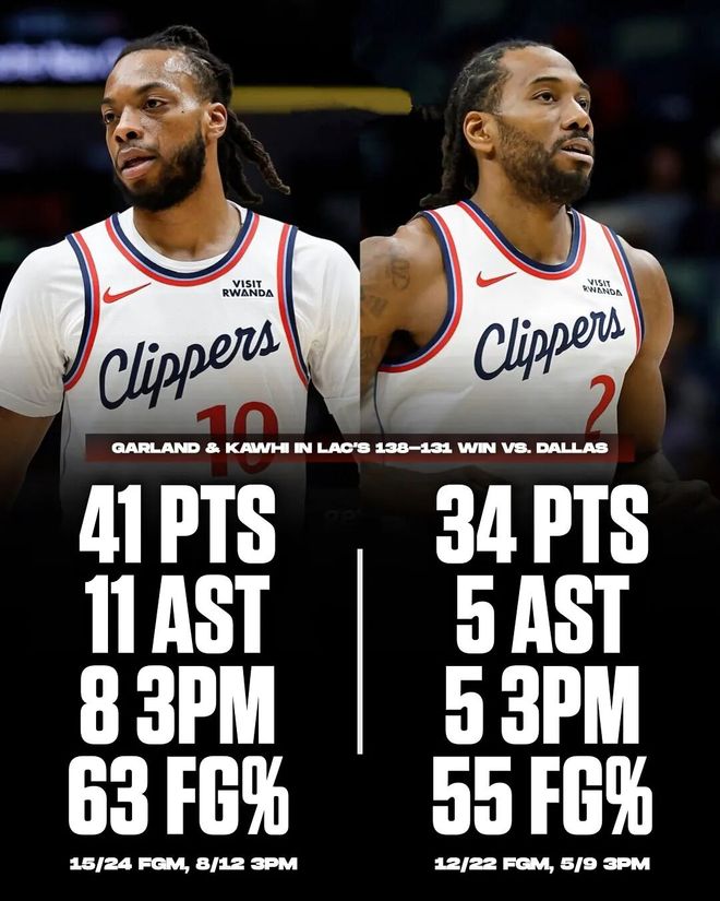 数据上看,伦纳德可能不是这场比赛快船最耀眼的——队友加兰全场拿到了41分3篮板11助攻,得分、助攻均为全队最高。