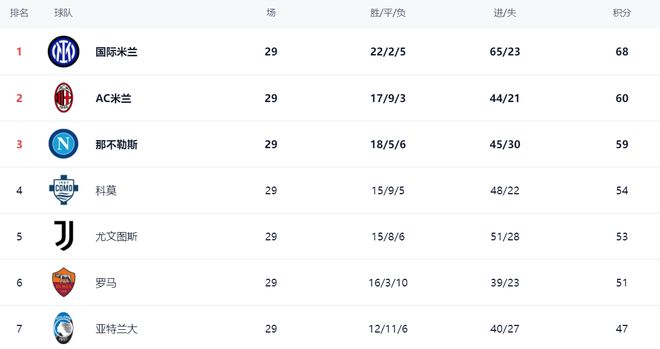 在积分榜上,国际米兰以68分占据榜首位置,战绩是22胜2平5负。这一轮国际米兰被亚特兰大逼平。本来是身后的AC米兰追分的好机会。没想到AC米兰爆冷落败,导致与国际米兰的差距变大了。AC米兰60分,落后8分!那不勒斯以59分排名第3。法布雷加斯率领科莫这匹大黑马击败罗马之后,杀入欧冠区,排名第4。尤文图斯53分,嗲到第5名。罗马掉队了,51分排名第6。
